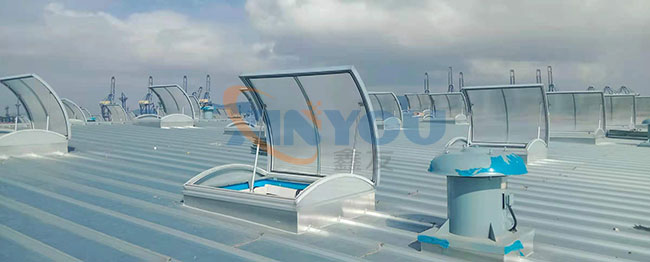 圓拱形的設計,外觀美觀大氣,能更好的防水,同時有效減少風壓阻力,天窗頂部為采光板,有效增加室內(nèi)亮度,開啟電機設計成24V電壓,可連接消防聯(lián)動控制系統(tǒng)及風、雨、煙感應器。***開啟角度為45°。